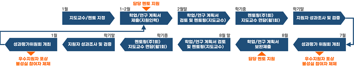 제재 대상자(다음 항목 중 하나 이상 해당자): 학업성취도 평균 C학점 이하, 과제 제출비율 40% 미만 또는 과제당 평균 평가점수 40% 미만, 연구참여도 다면평가 50% 미만 또는 연구성과 다면평가 40% 미만